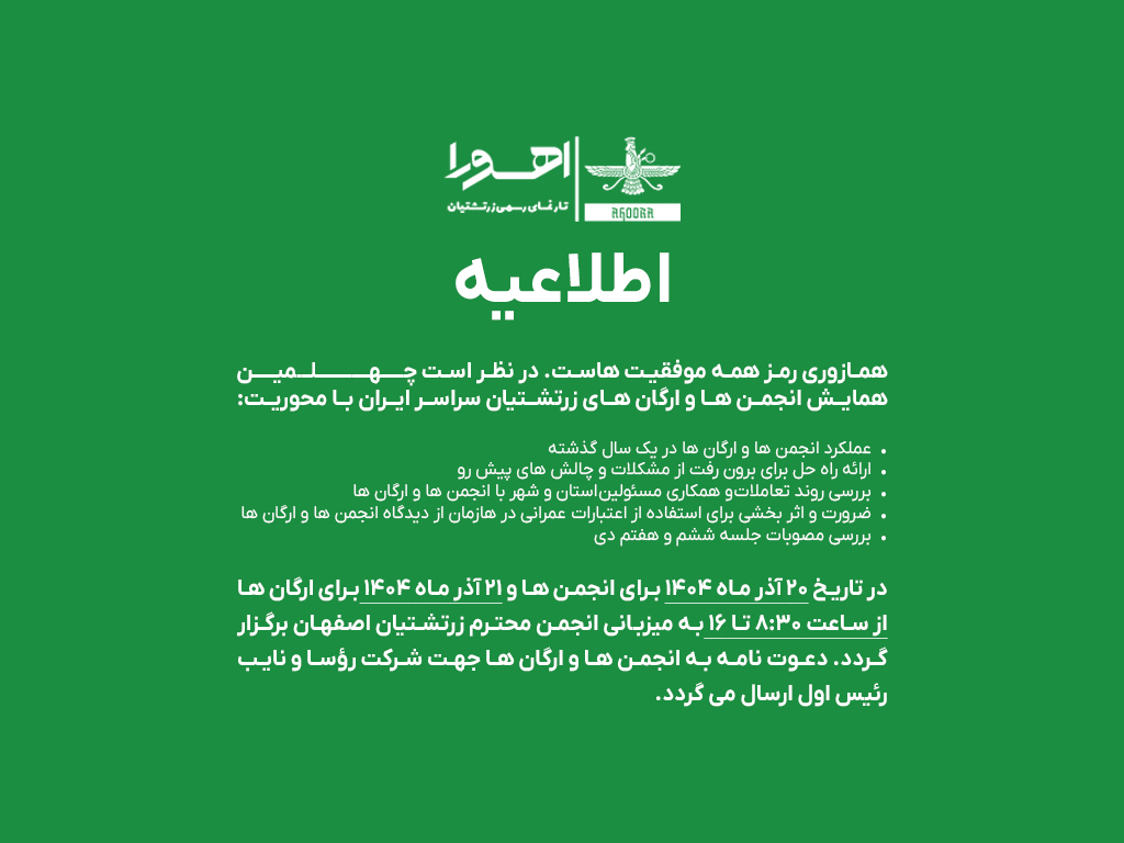 بررسی عملکرد، چالش‌ها و راهکارهای توسعه در جامعه زرتشتی – ۲۰ و ۲۱ آذر ۱۴۰۴ در اصفهان
